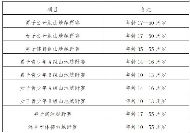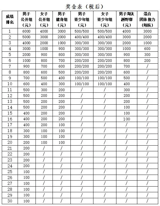 1.报名人数:男子公开组报名人数150人,女子公开组报名人数100人,男子健身组报名人数150人,男子青少年组报名人数100人,女子青少年组报名人数50人,男子淘汰越野赛报名人数64人,团体接力项目报名队伍不限。